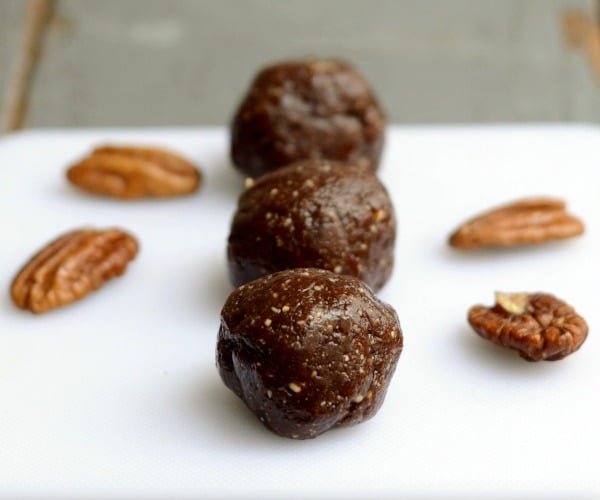 These chocolate pecan snacks are so good. You won’t believe they don’t have any added sugar when you taste them. The dates have a caramelizing effect, so these come out tasting like sweet, chewy candy. Pecans are rich in vitamins, minerals, and antioxidants, and dates provide potassium and fiber. These little goodies are the perfect afternoon snack for kids or adults who need an extra boost before dinnertime.