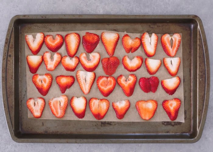- Thinly slice the strawberries about ¼ inch thick, and arrange them in a single layer on the baking sheets. The slices should be uniform in thickness, but if you end up with some thicker slices, put them on the outside of the cookie sheet, with thinner slices in the middle.