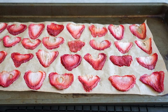 Place the strawberries in a single layer on two parchment-lined baking sheets. The slices should be uniform in thickness, but if you end up with some thicker slices, put them on the outside of the cookie sheet, with thinner slices in the middle.