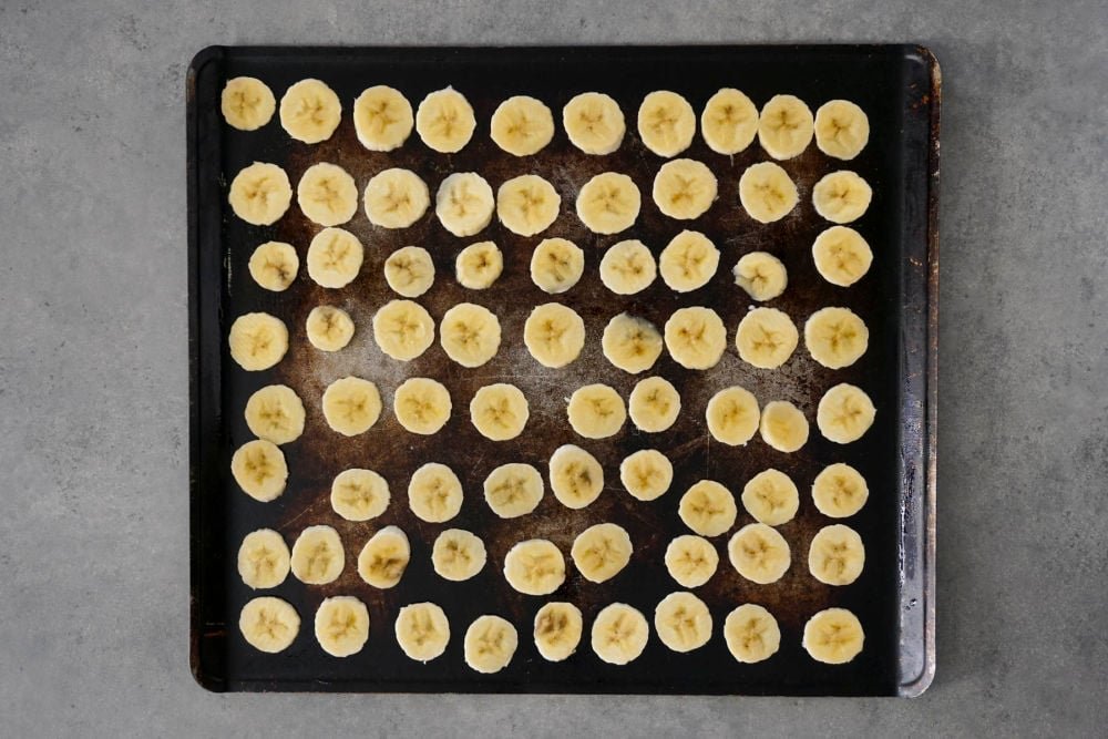 - Thinly slice the bananas (¼ inch thickness or less is ideal), and arrange them in a single layer on the baking sheets.