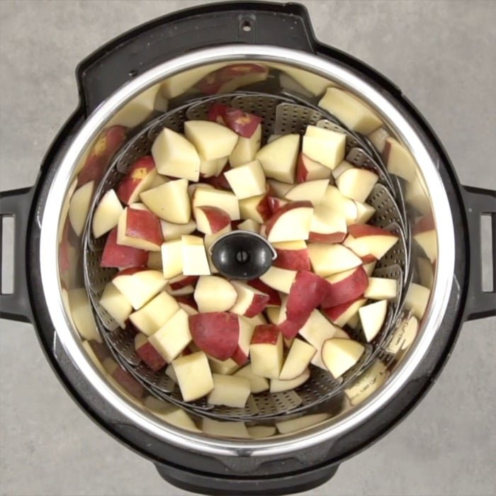 - Pour a cup of water into the Instant Pot, then add a steamer basket to the pot. Place the chopped potatoes and eggs in the steamer basket. Cover the lid, turn the valve to sealing, and set the Instant Pot to 4 minutes on manual high pressure. Once it’s done cooking, do a quick release and remove the steamer basket from the pot using a pot holder.