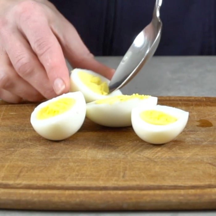 - Place the potatoes in a large bowl, and put the eggs in a bowl of ice water to cool a bit. Then peel each egg, cut in half, and remove the yolks to a small bowl. Mash the egg yolks with a fork. Add the mayonnaise, red wine vinegar, and mustard. Stir to combine evenly.