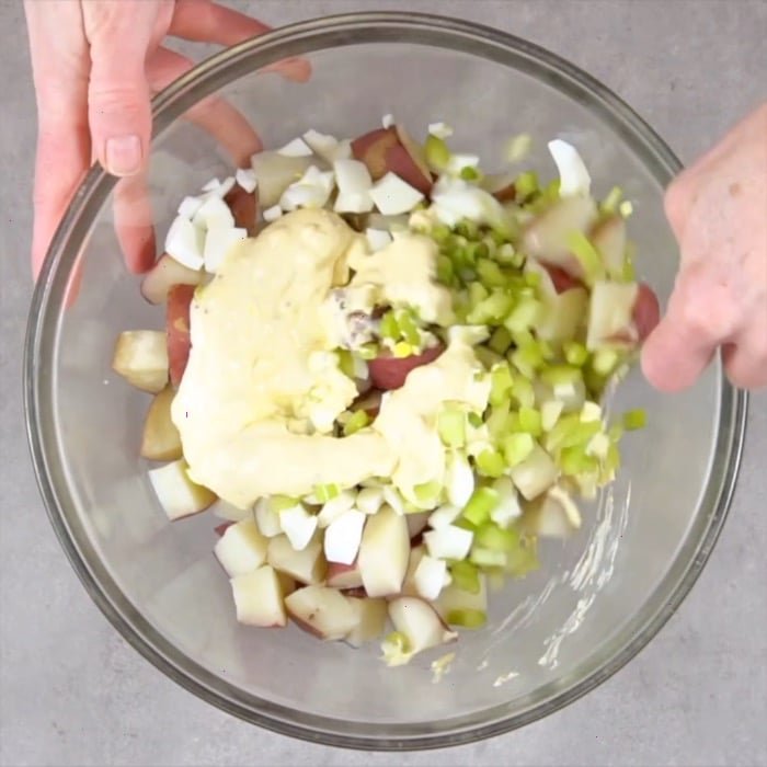 I prefer red potatoes because they hold their shape well. They yield the classic potato salad texture and look, and their thin red skin isn’t thick or gritty. If you’d prefer a creamier potato salad, you could use a starchy version like russet potatoes.