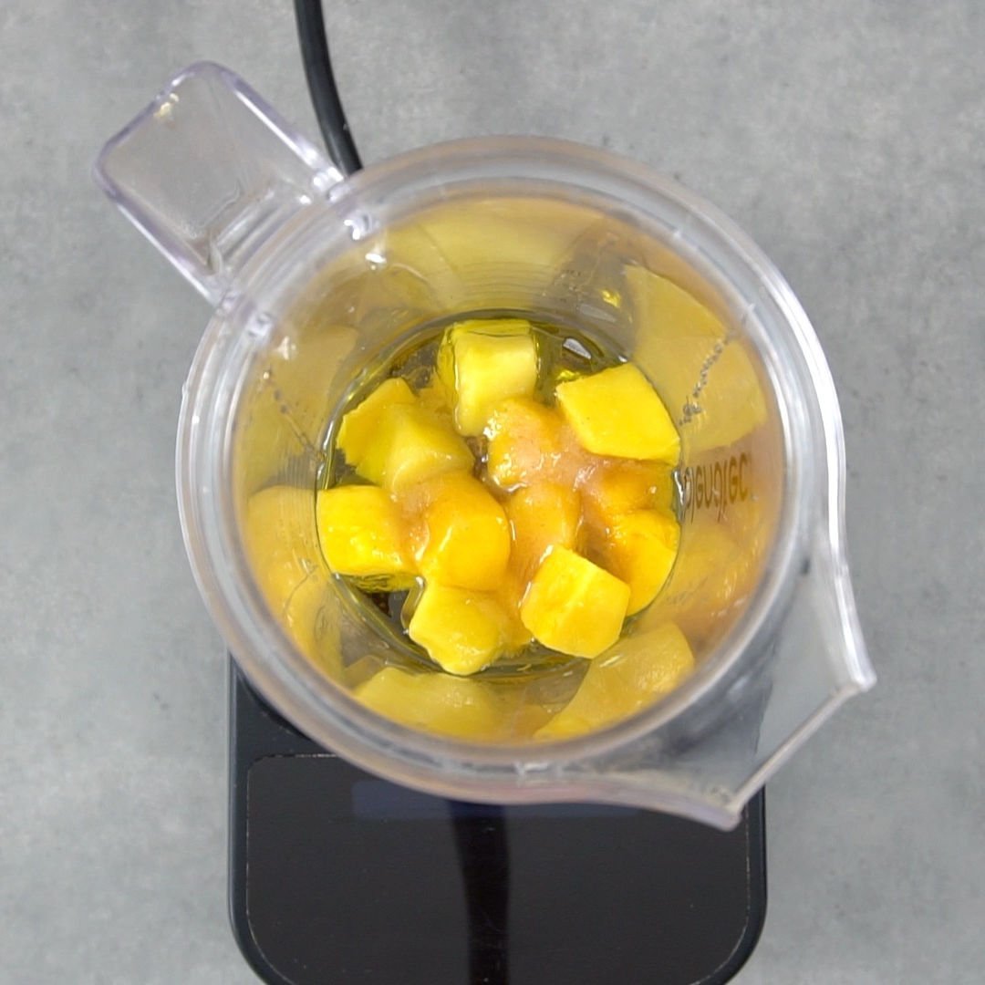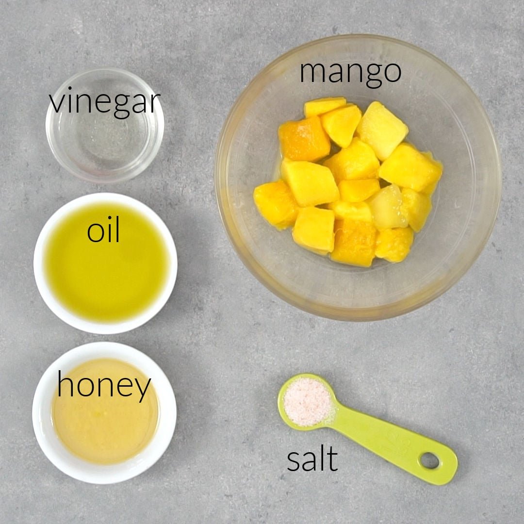 Gather the mango, vinegar, oil, honey, and salt. If you’re using frozen mango, defrost it first. If you’re using fresh mango, remove the peel and chop the mango into one-inch pieces.