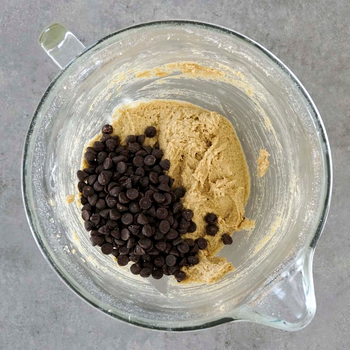 Use a wooden spoon to stir the chocolate chips into the dough, being careful to distribute the chocolate chips evenly.