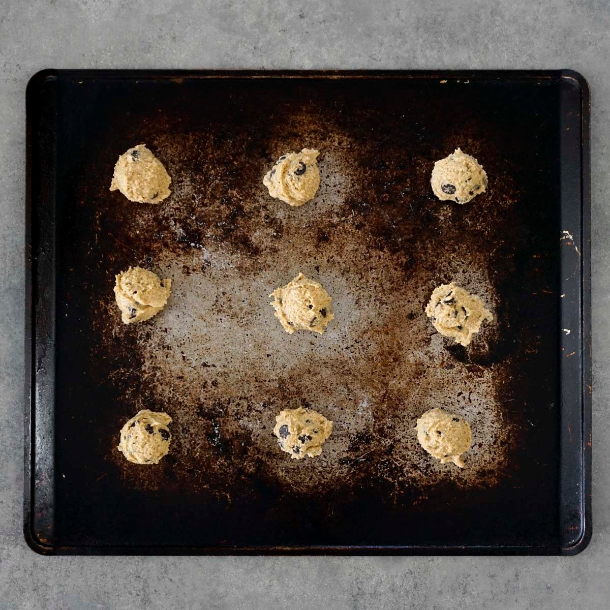 Use a 1 tablespoon cookie scoop to place the batter on a standard baking sheet, spacing 9 cookies evenly apart.