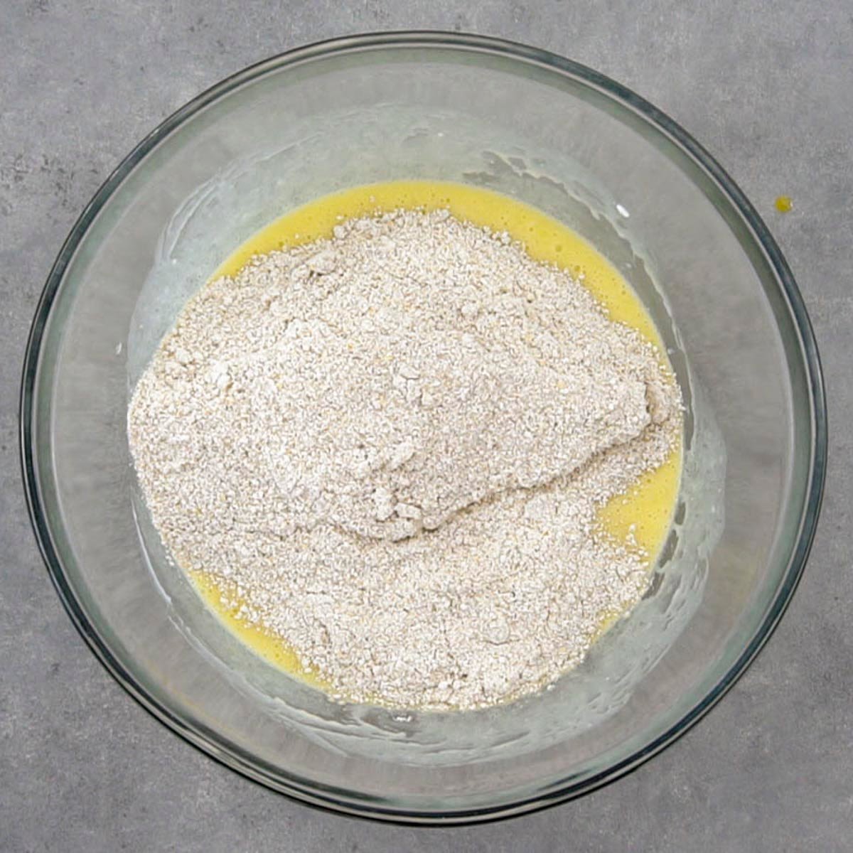 - In a medium bowl, stir together the oat flour, baking powder, cinnamon, and salt.