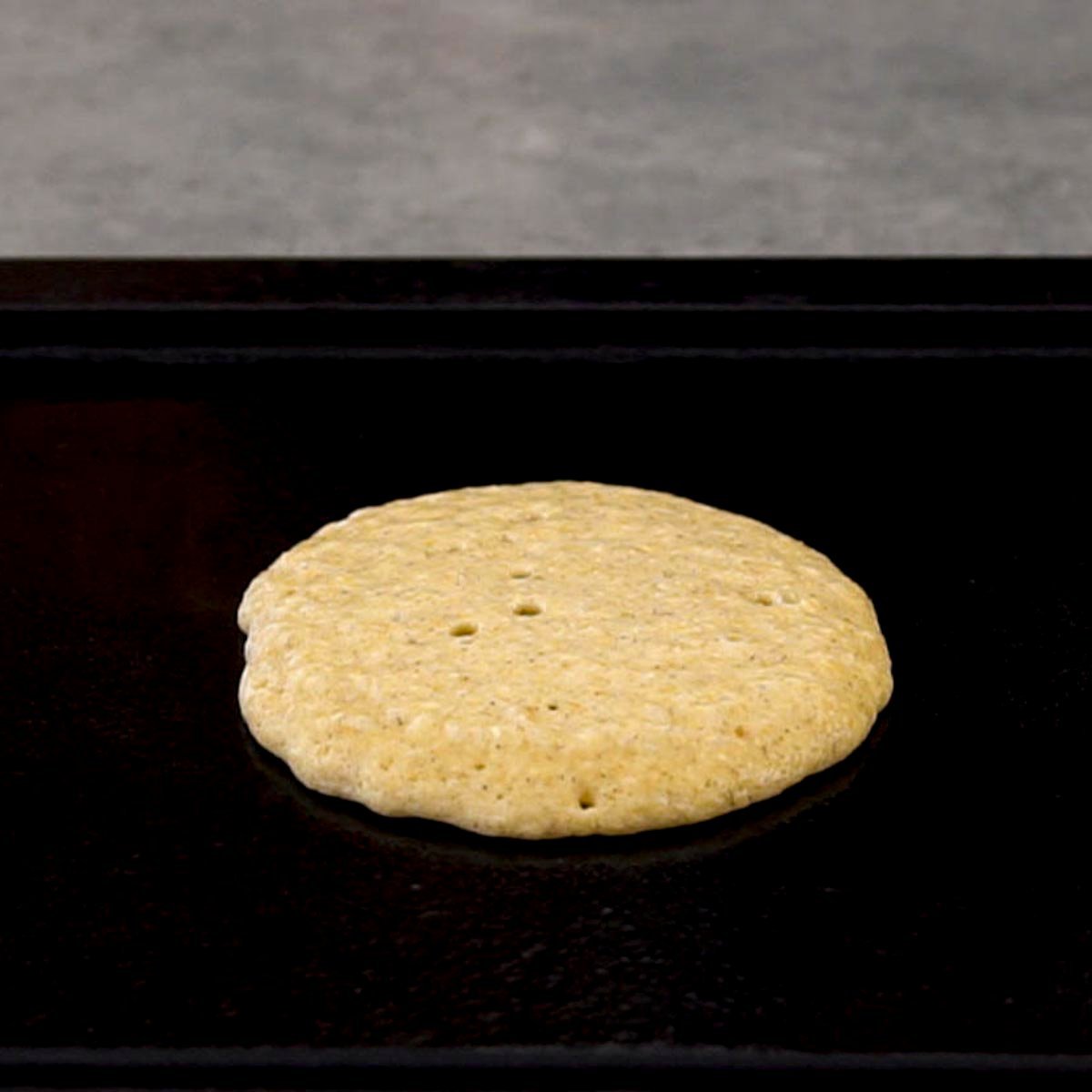 - Heat a seasoned griddle pan over medium high heat. Lower the heat to medium low, then pour circles of batter onto the griddle. Use about 1/4 cup of batter for each pancake to get 12 pancakes. Cook for one to two minutes on each side, flipping when the surface of the pancakes are dotted with small bubbles.